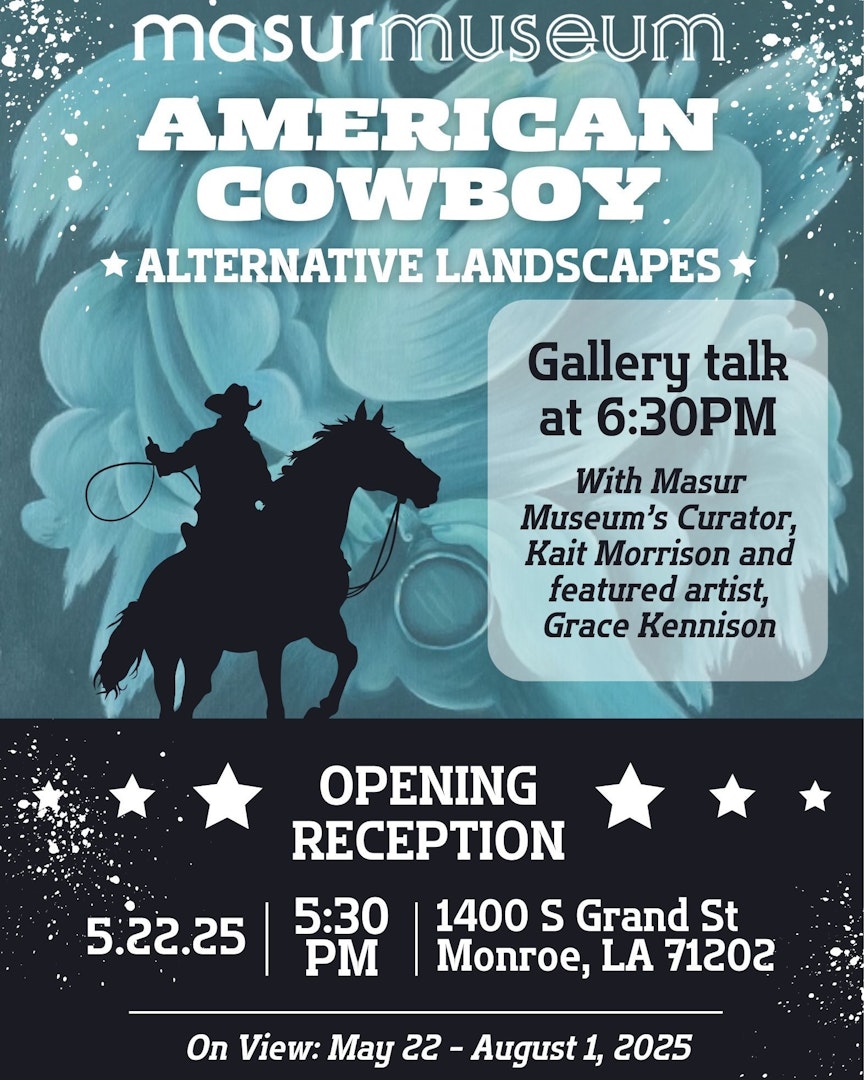 Join the Masur Museum of Art for the American Cowboy Opening Reception on May 22nd! This even starts at 5:30pm with a Galley Talk at 6:30pm with museum curator Kait Morrison and featured artist Graces Kennison. Light refreshments will be provided.