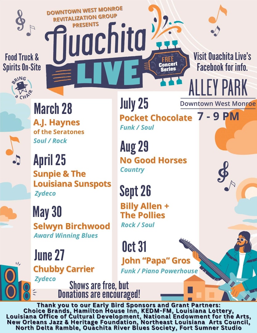 Join Downtown West Monroe at Ouachita Live for a free concert on the last Friday of the month through October. The next one will be on May 30th, and Selwyn Birchwood will be the headline. With delicious local food trucks and lively music, it's sure to be a great time!