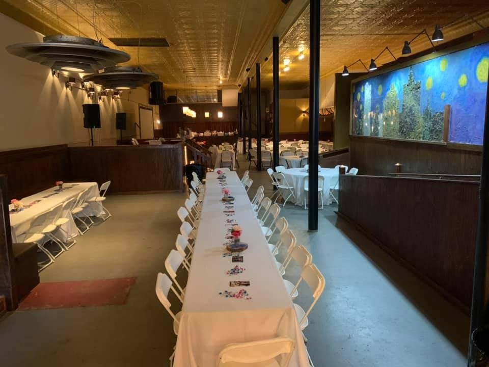 Over 5,000 square feet of event space for up to 250 guests, a bandstand, and huge bar area.