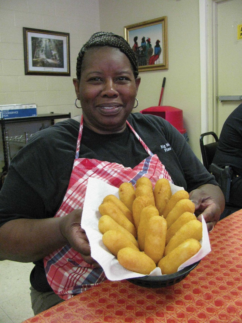 Daily plate lunches with good Southern vegetables like real mashed potatoes, butter beans, candied yams, greens (mustard and turnips), corn and black-eyed peas. Fantastic fried chicken and smothered pork chops too. You can't leave without trying some of Big Momma's hot water cornbread. And for dessert, a big piece of homemade cake, cobbler or pie.