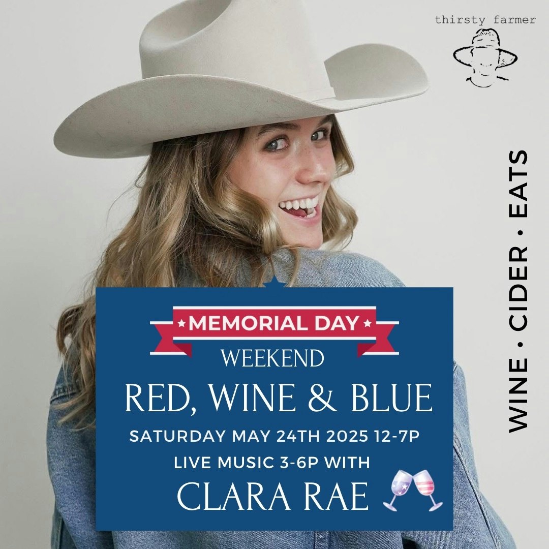 Celebrate Memorial Day at Thirsty Farmer! Enjoy live music by Clara Rae from 3-6pm along with delicious food, snacks, wines, ciders, and more. What better way to celebrate Memorial Day weekend than with a little wine?