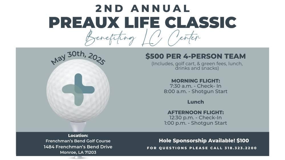 Join the Life Choices Pregnancy Resource Center for their 2nd Annual Preaux Life Classic golf tournament! Entry cost covers golf cart, green fees, snacks, lunch, and drinks. Check-in is at 7:30am, shotgun start at 8am. Click here to register!